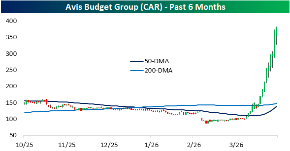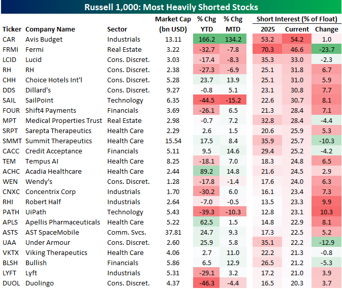 Again, the rally in CAR is in all likelihood a short squeeze. Short interest data as of the end of March was published last Friday, and those readings showed 54% of the float in CAR sold short. On that basis, it is the most heavily bet against stock in the Russell 1,000. Additionally, CAR appears to be the only heavily shorted name getting squeezed. In the table below, we show the 25 stocks with the most short interest in the Russell 1,000, and while a small majority are higher MTD, none are even close to the rally in CAR, nor is such a large share of float shorted. For example, Fermi (FRMI) started the year with a reading above 70%. That share is down to 46.6% as of the most recent data, as the stock has fallen 32.7% since the start of the year.