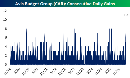 In a post yesterday, we highlighted how the S&P 500 recently snapped a seven-day winning streak while several individual members of the index have gone on historic winning streaks in their own respects. Given its monumental run, CAR can also be added to the list of winning streaks. As shown below, assuming it closes higher on Tuesday, it would be its tenth consecutive daily gain.