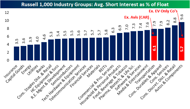Below, we show average short interest readings for all members of each industry group in the Russell 1,000. Due to CAR, the transportation industry is the fifth most heavily shorted group, although if that stock were removed, the industry would rank in the middle of the pack. A related industry is in a similar boat. The Automobile and Components industry ranks as the highest average short interest level at 9.6%. However, this is again due to some members being much more heavily shorted than others, namely: EV-focused stocks. Whereas legacy auto OEM and parts retailers have low to mid-single digit short interest levels, EV stocks have readings in the mid-teens and upwards of 30% for the most heavily shorted name: Lucid (LCID). LCID is also the third most heavily shorted stock of all Russell 1,000 members. Additionally, we would note that these EV names do have one exception. Tesla (TSLA) is actually the least shorted stock in the industry, currently below 2% per the most recent print.