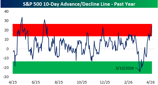 The Iran war resulted in a tough March for US equities. In addition to the S&P 500 falling close to 10% versus its 52-week high, breadth took a measurable hit. As shown below, up until the first week of March, the 10-day advance/decline line, which measures the net share of index members rising or falling each day over ten days, was positive for most of the year. Once equities began selling off, this measure tanked, and at the low on March 13th, it reached the lowest level since 12/19/24, which also ranks as a 2nd percentile reading going back to 1990. With the benefit of hindsight, we can now say that low in breadth pre-dated the low in price (which came on March 30th). It has now been ten trading days since the low, and daily breadth has been positive all but twice (April 7th and April 10th were the only days with negative daily breadth). As a result, the 10-day A/D line is now at the highest levels since 7/10/25.