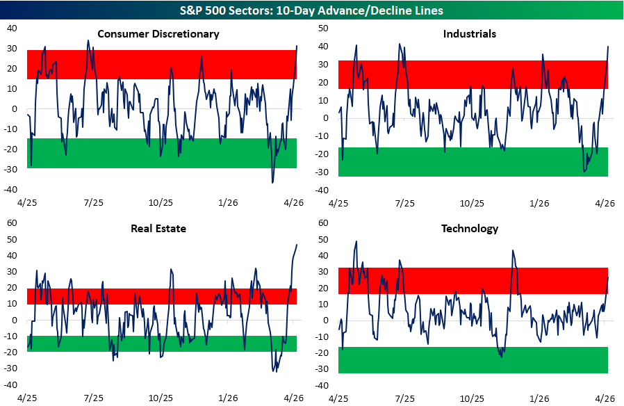 As we highlighted in yesterday’s Sector Snapshot, not only has the S&P 500’s 10-day A/D line risen sharply, but several other sectors have as well. As shown below, Consumer Discretionary, Industrials, and Real Estate all went from extreme oversold readings (2+ standard deviations below the historical average) to extreme overbought readings today. While the reading isn’t quite as extreme, Tech has also seen a sharp rise in its line.