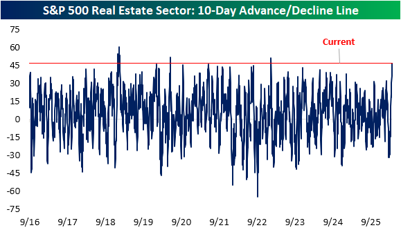 As might be evident from the one-year charts above, by far the most extended breadth measure comes out of the Real Estate sector. To give greater historical context, below we show the 10-day A/D line going back to September 2016, when it became a sector. With another move higher today, Real Estate’s 10-day A/D line is at the highest level since 2/2/23. The only other times the 10-day A/D line was more elevated were from January to February 2019 and in June 2020.