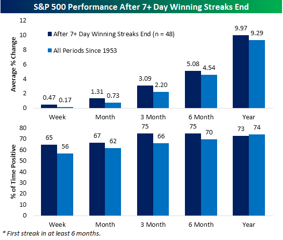 Again, winning streaks lasting at least 7 days have been somewhat uncommon. Filtering out those streaks to only look at those without another one in the prior six months, as was the case recently, there have been 48 instances since the start of the five-day trading week in 1953. As shown below, from the close of the first down day that ended those winning streaks, the S&P 500’s average performance has been modestly stronger than the norm and consistently positive in the weeks and months ahead.