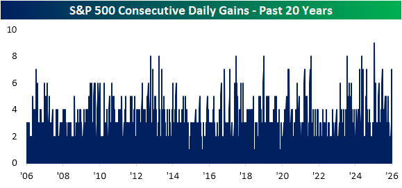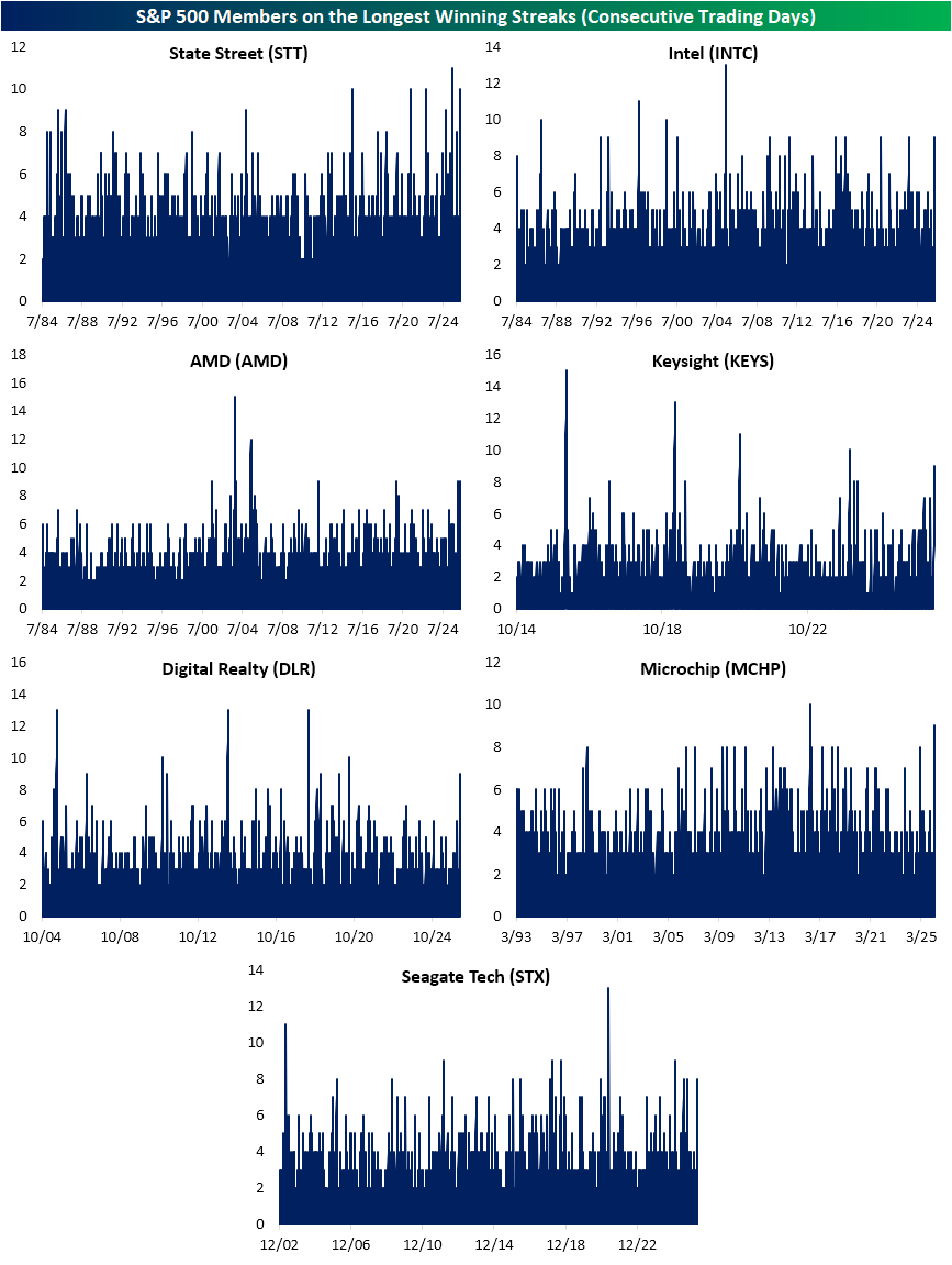 The broad index isn’t alone in stringing together a number of up days in a row. Of all S&P 500 members, seven are currently on even longer winning streaks of at least nine trading days, with one stock, State Street (STT), now on a ten-day winning streak. In the charts below, we show how those streaks stack up versus their respective histories. None of these winning streaks has gone on long enough to be records, although STT and Microchip (MCHP) are each only one day away. We would note that most of these stocks, other than STT, are in the Tech sector or adjacent to it. Regarding Intel (INTC), its winning streak is one of many that have lasted 9 days throughout its history, but as we discussed in an earlier post, there hasn’t been a time since 1984 that it has risen by more in such a span.
