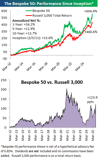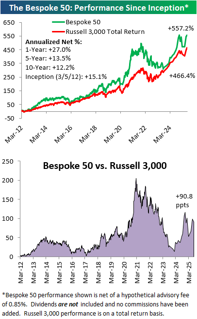 The Bespoke 50 performance chart shown does not represent actual investment results. The Bespoke 50 is updated monthly on Thursdays unless otherwise noted. Performance is based on equally weighting each of the 50 stocks (2% each) and is calculated using each stock’s opening price as of Friday morning after publication. Entry prices and exit prices used for stocks that are added or removed from the Bespoke 50 are based on Friday’s opening price. Any potential commissions, brokerage fees, or dividends are not included in the Bespoke 50 performance calculation, but the performance shown is net of a hypothetical annual advisory fee of 0.85%. Performance tracking for the Bespoke 50 and the Russell 3,000 total return index begins on March 5th, 2012 when the Bespoke 50 was first published. Past performance is not a guarantee of future results. The Bespoke 50 is meant to be an idea generator for investors and not a recommendation to buy or sell any specific securities. It is not personalized advice because it in no way takes into account an investor’s individual needs. As always, investors should conduct their own research when buying or selling individual securities. Click here to read our full disclosure on hypothetical performance tracking. Bespoke representatives or wealth management clients may have positions in securities discussed or mentioned in its published content.