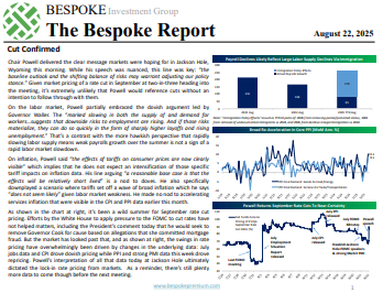 To read our weekly Bespoke Report newsletter and access everything else Bespoke’s research platform offers, start a two-week trial to Bespoke Premium. This week, Fed Chair Powell signaled a cut is almost a given at the next FOMC meeting. His embrace of dovish arguments on both the labor markets and inflation drove a massive rally in stocks to end the week, both in the US and Europe. Other markets are also performing well with investment grade corporate bonds trading at a record low risk premium this week. We also discuss earnings, AI stocks, custom baskets of stocks that tease out market narratives, and more in this week’s report. Give it a read!