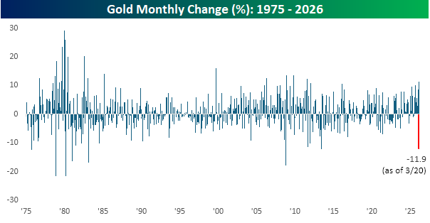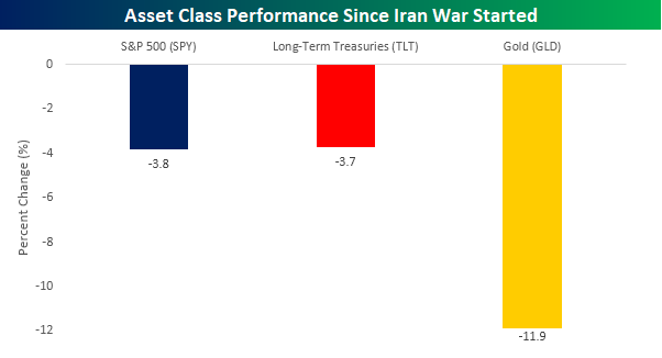 Heading into today’s session, the S&P 500 is down nearly 4% this month, which is unsurprising given the war in the Middle East. It’s only natural in times of geopolitical uncertainty for investors to move out of riskier assets into the safety of treasuries or even gold, the ultimate port in geopolitical storms. So, how are those two asset classes doing this month? Long-term treasuries, as proxied by the iShares 20+ Year Treasury ETF (TLT), are down 3.7%, which is basically in line with the S&P 500, while gold (GLD) is down more than triple either of the other two, with a decline of 11.9%. Just when you think you have it all figured out.