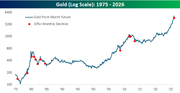 Gold’s double-digit percentage decline this month is on pace for the largest monthly decline in the commodity since June 2013 and, if it holds, would rank as the eighth largest one-month decline in gold since at least 1975. What’s even more interesting is that this month’s decline follows a double-digit percentage gain in February.