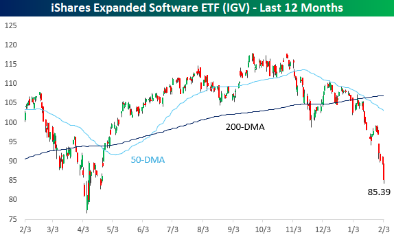 Yesterday was a rough day for the markets and especially technology, and with a decline of over 2%, it was easily the worst-performing sector on the day. Software stocks were especially hit hard as the iShares Expanded Software ETF (IGV) fell more than 4.5%, taking it down to levels not seen since the tariff-tantrum last April. Year-to-date, the ETF has already declined over 19%.
