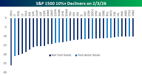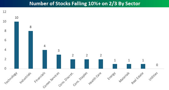 Finally, the chart below shows the sector breakdown of the 34 stocks that declined 10% or more yesterday. Tech obviously leads the list, but Industrials had eight stocks on the list, and Financials had four. In fact, the only sector not represented was Utilities.