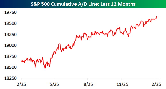 With RSP outperforming SPY yesterday, you can guess that breadth was positive, and that helped to push the S&P 500’s cumulative advance/decline line to a new all-time high. Certain heavily weighted sectors of the market have been under pressure recently, but overall breadth has been very strong.