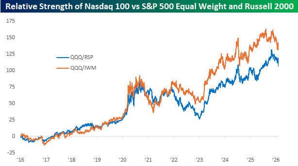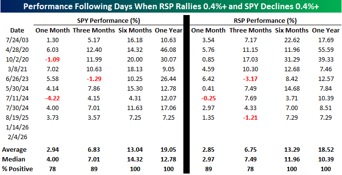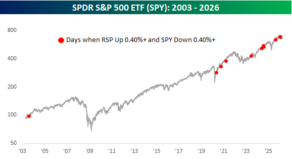 It’s only happened 11 times in the last 20+ years, but in the last three weeks, we’ve seen it occur twice. What is it? Yesterday, the SPDR S&P 500 ETF (SPY) fell 0.48% while the Invesco S&P 500 Equal Weight ETF (RSP) rallied 0.87%. That was just the 11th time since RSP’s inception in 2003 that SPY fell more than 0.4% while RSP rallied more than 0.4% on the same day. The most recent occurrence was in mid-January, and most have been in the last five years, as the top-heavy nature of the market has intensified, making disparities like yesterday less of an anomaly.