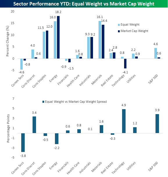 The trend of equal-weight outperforming market-cap weight this year hasn’t just been applicable at the index level. As shown below, the equal-weight version of seven different sectors are outperforming their market-cap weighted peers on a YTD basis. The biggest equal-weight outperformers have been Technology and Consumer Discretionary, while the cap-weighted versions of the Communication Services and Energy have been the biggest outperformers.