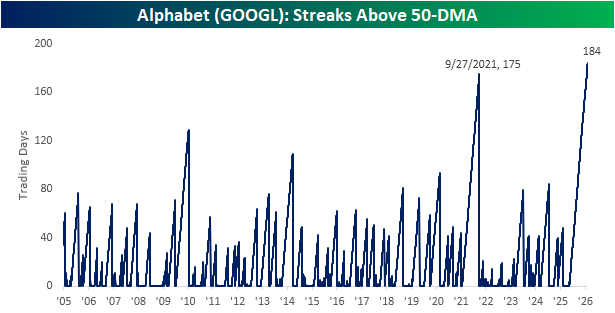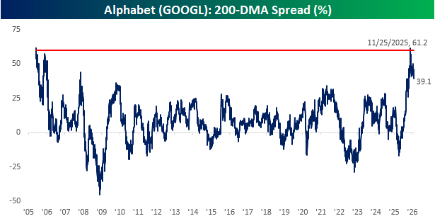 What you’ll also notice looking at GOOGL’s price chart is how much space there is between the stock’s price and its 200-DMA. As of yesterday’s close, GOOGL was 39.1% above its 200-DMA, which is among the highest readings on record, Even more incredible is that in late November, it was more than 60% above its 200-DMA, which was right up there with the record high spread of 61.7% from way back in June 2005, less than a year after the stock’s IPO.