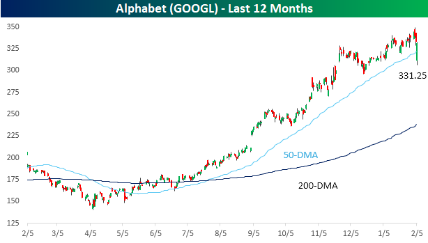 As mentioned above, GOOGL was on pace for a much larger decline yesterday, following its incredible boost to CapEx guidance on Wednesday. Shortly after the open, the stock was down over 8% and well below its 50-DMA, but buyers stepped in throughout the trading day, and the stock finished down less than 1% and outperformed all of the major US equity indices in the process. Yes, GOOGL was actually a positive (or less negative) contributor to yesterday’s market performance!