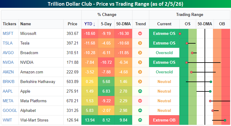 It’s well established that the trillion-dollar market cap stocks no longer trade as a monolith to the upside, but unfortunately for bulls, it looks increasingly like they trade in unison to the downside. On a YTD basis, there’s plenty of dispersion in performance. Among the group’s worst performers, we’re less than a week into February, but Microsoft (MSFT), Tesla (TSLA), and Broadcom (AVGO) are all down over 10% YTD. Another two stocks – Nvidia (NVDA) and Amazon.com (AMZN) are down YTD (AMZN will be down over 10% at the open this morning). On the upside, the gains aren’t nearly as large as the losses, but Wal-Mart (WMT) has managed to gain close to 14% while Alphabet (GOOGL) managed to hang on to a gain of over 5% after yesterday’s intraday bounce.