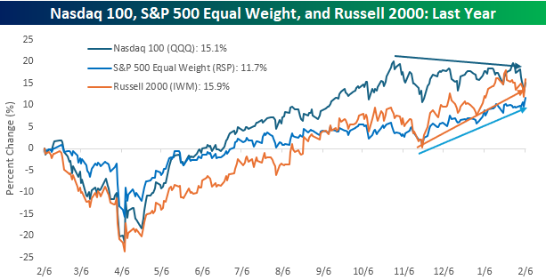 Looking at the performance of the Nasdaq 100, S&P 500 Equal Weight (RSP), and the Russell 2000 (IWM) ETFs over the last year shows an interesting shift. Since its peak last October, the Nasdaq 100 has been drifting lower while both the S&P 500 Equal Weight and Russell 2000 have rallied. The result is that the Russell 2000 is now outperforming the Nasdaq 100 over the last year, and the S&P 500 Equal Weight Index is rapidly closing the gap.