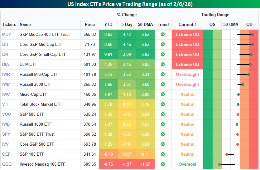 The diverging performance of small and large-cap stocks continued last week. The most overbought US index ETFs to close out the week are all generally smaller-cap and non-tech focused, while anything associated with mega-caps was down. In a week when the Dow (DIA) was up over 2% and closed at an all-time high, the Nasdaq 100 (QQQ), S&P 100 (OEF), and even the S&P 500 (SPY) were all lower. The Nasdaq 100’s 2% decline moves that index not only below its 50-DMA but also into oversold territory. At the other extreme, smaller and mid-cap indices, along with the Dow, are at various degrees of overbought levels.