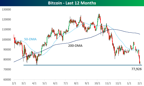 Along with growth-oriented stocks, crypto assets have been terrible performers for the last few months, and over the weekend, Bitcoin tested 52-week lows near $75K. Prices are rebounding slightly this morning along with equity futures, but the burden of proof is firmly on the back of the bulls now as Bitcoin’s price trades near the breakeven price for all of Strategy’s (MSTR) holdings.