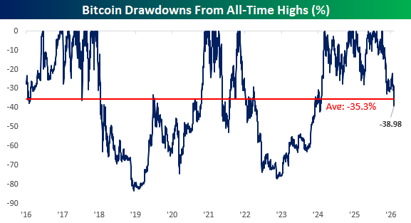 While it’s been a painful few months for crypto, it’s worth pointing out that this remains just a run-of-the-mill decline for Bitcoin. While it’s currently down about 39% from its all-time high, on any given day since 2016, its average drawdown from an all-time high has been over 35%.
