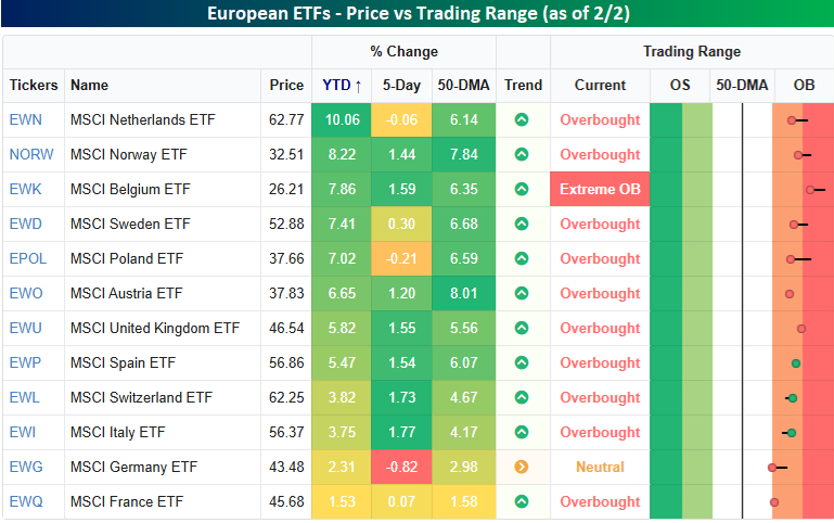 Looking at individual country performances within Europe, the snapshot below from our Trend Analyzer shows the performance of country ETFs on the continent. Of the 12 ETFs shown, all of them are up YTD, and France is the only one underperforming the S&P 500. Most of the countries have outperformed the US by a wide margin. The Netherlands (EWN) ETF is up over 10% already this year, and seven other countries have gained at least 5%. Most of the countries are also comfortably above their respective 50-day moving averages and well into short-term overbought territory. The only exception is Germany (EWG), which is also down the most over the last week (-0.82%).