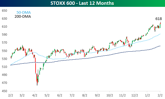 After two weeks of sideways trading, European stocks went into lift-off mode yesterday as the STOXX 600 surged more than 1% to a new all-time high. This morning, the European benchmark index added to those gains before pulling back modestly, although it’s still up for the day. YTD, the STOXX is already up over 4%, or more than twice the 1.9% gain for the S&P 500.
