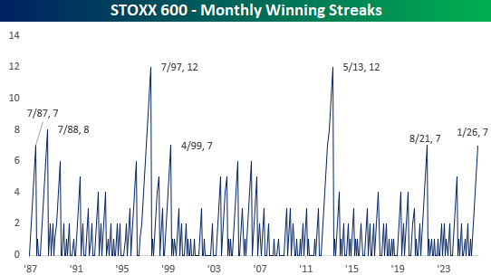 Like the Dow Jones, which has had nine months in a row of gains, the STOXX 600 has been up for seven straight months. That ranks as tied for the longest streak since May 2013 and tied for the fourth-longest on record.