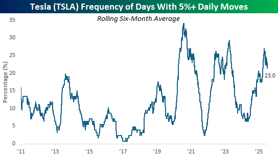 Normally, as companies become larger in terms of market cap, their share prices become less volatile, but that’s not the case with TSLA. Yesterday was the 29th daily gain or loss of 5%+ in TSLA over the last six months, which works out to 23% of all trading days. While the company went public in 2010, it wasn’t until 2020 that TSLA routinely started to see 5%+ daily moves on 20% or more of trading days over a rolling six-month period.