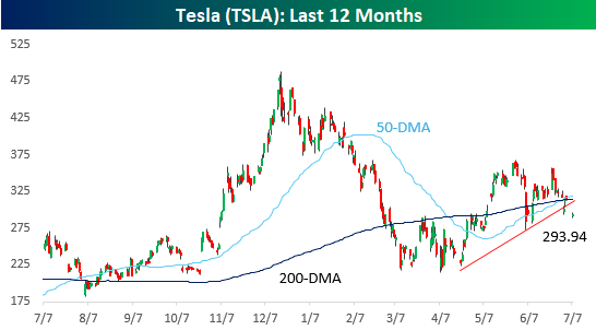 Yesterday’s decline broke TSLA’s uptrend off the April lows, and that came after making a lower high in late June. All this came after the stock made a golden cross (50-day moving average cross above the 200-day moving average as both are rising) last week, which technicians consider a positive technical formation. Fitting for a stock like TSLA, the stock’s trading pattern has been sending mixed signals.