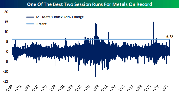 Looking for deeper insight into markets? In tonight’s Closer sent to Bespoke Institutional clients, we lead off with a dive into the parabolic moves in metal prices (pages 1 and 2). We also give some commentary on the latest Congressional news followed by a look into auto sales data (page 3). After a look at the latest Logistics Managers Index (page 4), we close out with a review of some of the latest investor sentiment gauges (page 5).