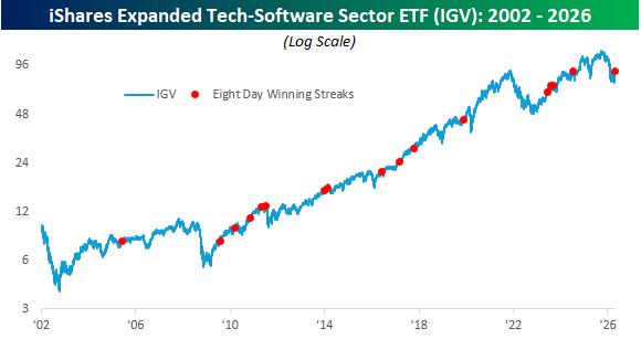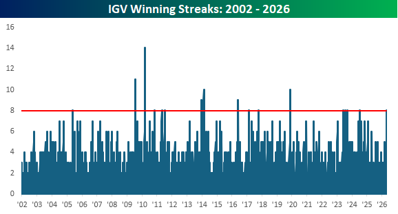 Semis and software have generally moved in opposite directions this year, but over the last several days, both have moved higher. Semis extended their streak of daily gains to a record 15 trading days yesterday, and the streak in software stocks has been half as long. As shown in the chart below, the iShares Expanded Tech Software Sector ETF (IGV) has traded higher for eight straight days, making it tied for the longest daily winning streak since late 2019. With the ETF trading down close to 3% this morning, though, we wouldn’t bet on the streak extending to a ninth day.