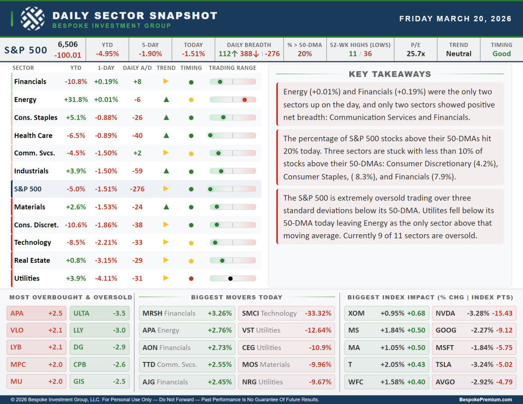 To read our weekly Bespoke Report newsletter and access everything else Bespoke’s research platform offers, start a two-week trial to Bespoke Premium. This week we are closely focused on the three week war in Iran and its consequences for energy markets and the economy. The conflict has driven a massive surge in energy stocks around the world with US refiners especially benefitting. But broad indices have plunged into deep oversold territory as stocks reel from a sudden and extreme shift in central bank pricing. We recap a long list of central bank decisions across emerging and developed markets as well as the chaos in bonds markets that spent the week waking up to the risks for interest rates of significant global petroleum shortages. We also review economic data, which this week showed an economy with surprisingly solid labor markets, healthy balance sheets, and accelerating inflation…even before the impacts of oil price surges.