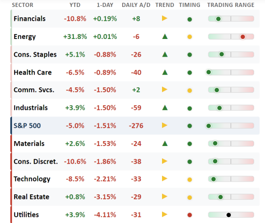 The next section is a matrix of the eleven S&P 500 sectors showing year to date and daily performance, the daily net advance/decline reading, a trend score (red arrows for downtrends, yellow arrows for sideways trends, and green arrows for uptrends), timing scores (red dots for poor, yellow dots for neutral, and green dots for good), and finally, a trading range chart. These bars’ midpoints are the sector’s 50-DMA, with the dot showing how far (in standard deviations) price is currently trading from that moving average. Readings further to the left or right indicate more extreme oversold or overbought readings, respectively. This matrix is sorted from best to worst based on one-day percentage change.