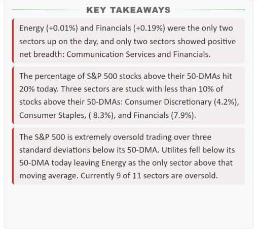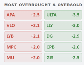 The bottom third of the page is dedicated to showing individual S&P 500 members that are standing out in various ways. The bottom left table shows the five S&P 500 stocks that are most overbought and oversold. This section includes tickers and how far each one is trading (in standard deviations) above or below its 50-DMA. Tickers in red are the most overbought stocks in the index, while tickers in green are the most oversold.