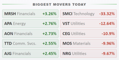 The bottom middle section highlights the S&P 500’s five biggest winners and losers each day: