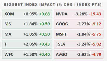 And finally, the bottom right section shows the five stocks that had the largest positive and negative impact on S&P 500 performance that day. For each of these stocks, its daily percentage change is shown in grey, while the numbers in green and red show the impact (in points) each stock had on the S&P 500’s price move that day.