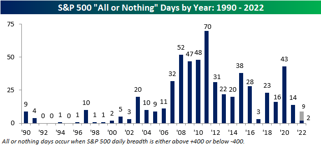 The chart below shows the number of all-or-nothing days in the market by year going back to 1990. While the pace of all-or-nothing days was very slow from 1990 through the early 2000s, once the Financial crisis arrived, the frequency really started to pick up and has stayed elevated ever since. Since 2007, the average number of all-or-nothing days has been 32 per year, but at this year’s rate, the S&P 500 is on pace for just nine all-or-nothing days, which would be the lowest since 2017 and just the second year since 2006 that the total was in the single-digits. Again, there’s still a lot of time left in 2022 for this pace to change, but at the current rate, 2022 is shaping up to be an outlier of a year.