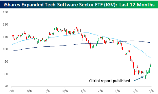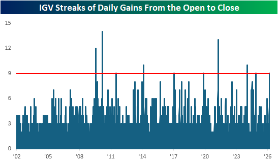 Over the course of that 13% rally, IGV has traded higher in eight of the last nine trading days, including today’s fractional gain as of midday. Not only has IGV traded consistently higher, but there has also been steady buying throughout the trading day. In each of those nine days, even on the one day it traded lower, IGV traded higher from the open to close. While there have been five other streaks where IGV had more consecutive days of gains from the open to close, the current streak is tied with four other periods for the sixth-longest streak in the ETF’s history. It’s always easier to see in hindsight, but underneath all the snow on 2/23, there was plenty of blood on the software streets.
