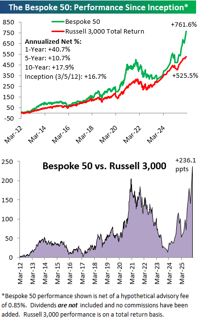 The Bespoke 50 performance chart shown does not represent actual investment results. The Bespoke 50 is updated monthly on Thursdays unless otherwise noted. Performance is based on equally weighting each of the 50 stocks (2% each) and is calculated using each stock’s opening price as of Friday morning after publication. Entry prices and exit prices used for stocks that are added or removed from the Bespoke 50 are based on Friday’s opening price. Any potential commissions, brokerage fees, or dividends are not included in the Bespoke 50 performance calculation, but the performance shown is net of a hypothetical annual advisory fee of 0.85%. Performance tracking for the Bespoke 50 and the Russell 3,000 total return index begins on March 5th, 2012 when the Bespoke 50 was first published. Past performance is not a guarantee of future results. The Bespoke 50 is meant to be an idea generator for investors and not a recommendation to buy or sell any specific securities. It is not personalized advice because it in no way takes into account an investor’s individual needs. As always, investors should conduct their own research when buying or selling individual securities. Click here to read our full disclosure on hypothetical performance tracking. Bespoke representatives or wealth management clients may have positions in securities discussed or mentioned in its published content.