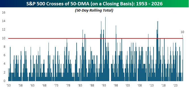 Semis and software are two of the market’s largest sectors, and each one moving in the opposite direction has contributed to the ping pong action at the overall index level. As we noted on X yesterday, the S&P 500 has now crossed its 50-day moving average on a closing basis ten times in the last 50 trading days. That’s the longest streak since March 2018 and one of only a handful of periods with that many crosses in such a short period of time. As we’ve all said to someone close to us multiple times, make up your mind already!
