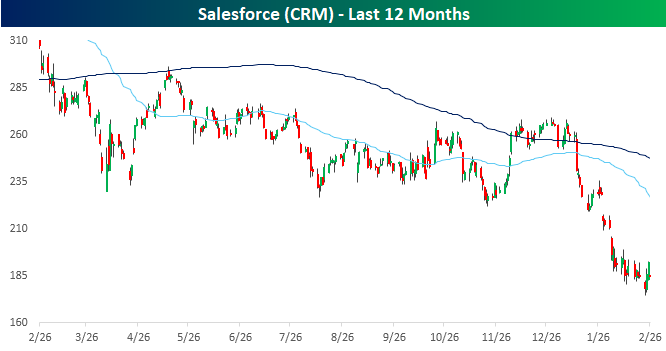 While semis have been strong, software stocks continue to try digging out from the AI-pocalypse. The latest setback for the sector was earnings from Salesforce (CRM) last night. CRM exceeded EPS forecasts on inline revenues. Guidance was mixed with the company raising Q1 EPS forecasts while keeping full-year forecasts in line with expectations. Despite a somewhat positive report at the surface, CRM is down more than 2% in the pre-market.