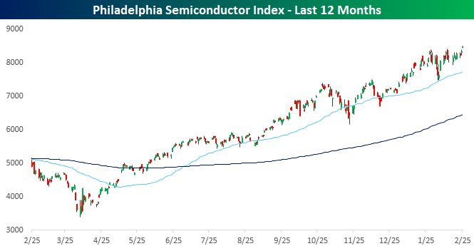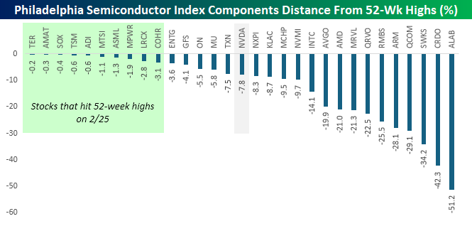 Along with the index itself, breadth in the sector has also been strong. Yesterday alone, nine of the index’s 30 components hit 52-week highs, even as NVDA closed nearly 8% below its respective high.
