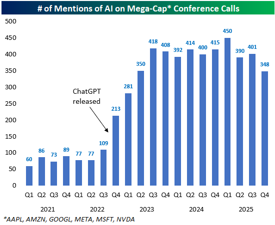 Now that NVDA has reported and completed its conference call, we can update our chart of “AI” mentions from the mega-cap hyperscalers this earnings season. Across the conference calls of Apple (AAPL), Amazon (AMZN), Alphabet (GOOGL), Meta (META), Microsoft (MSFT), and NVIDIA (NVDA), “AI” was mentioned 348 times this quarter. As shown below, that’s down quite a bit from the 401 “AI” mentions last quarter, and it’s 102 fewer than the peak “AI” reached during the Q1 2025 earnings season.