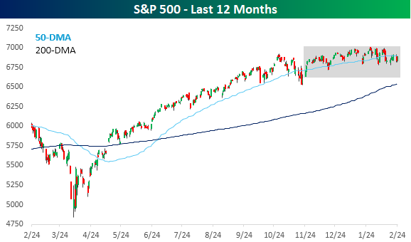 Given the ongoing weakness we have seen in certain areas of the market, which investors now think will be devastated by AI, it’s still hard to believe how range-bound the S&P 500 has been. Yesterday, the S&P 500 closed less than 0.1% below its 50-day moving average. You can’t get much closer than that! And it wasn’t just yesterday. The rangebound morass has been going on for months now, as there hasn’t been a day in the last three months where the S&P 500 closed more than 2.5% above or below its 50-day moving average.