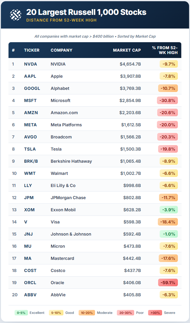 If you’re interested, below is a look at the twenty largest stocks in the Russell 1,000, along with each one’s current distance fromits 52-week high. Of the $1+ trillion companies, Microsoft (MSFT) is in the biggest drawdown at -30.8%, followed by Amazon (AMZN), Meta (META), Broadcom (AVGO), and Tesla (TSLA) – all around -20%. Oracle (ORCL) is the farthest from 52-week highs of the names listed at -59%, while Johnson & Johnson (JNJ) is the closest at just -1%.