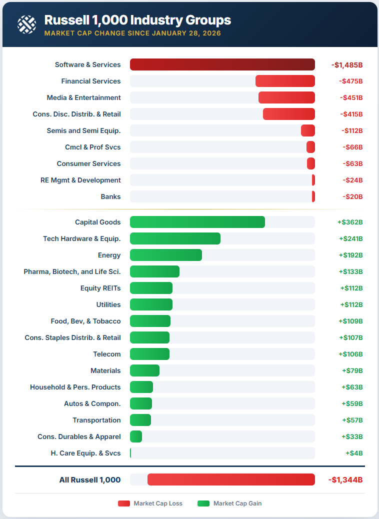 Within the broader large-cap Russell 1,000 (R1K), the average stock in the index is down just 0.3% since 1/28. But we’ve seen the market lose about $1.34 trillion in market cap over this time frame. Most of that can be chalked up to the “AI Doom” trade, where groups like Software & Services and Financial Services have been pummeled because of the threat that AI will make them obsolete.