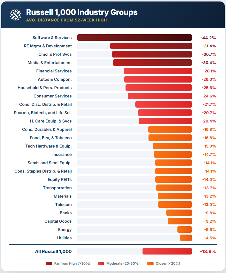 The average Russell 1,000 stock is currently about 19% below its 52-week high. Four groups are at -30%: Software, Real Estate Management & Development, Commercial & Professional Services, and Media & Entertainment. On the flip side, the average Utilities stock is less than 5% from its 52-week high.