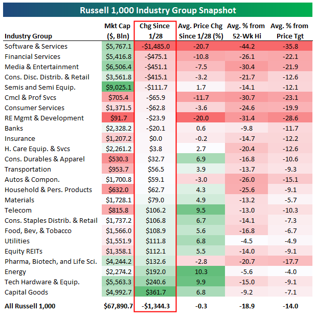 Below is a look at the average stock’s percentage change since 1/28 by industry group. Software and Real Estate Management & Development stocks have easily seen the biggest drops at -20%+.