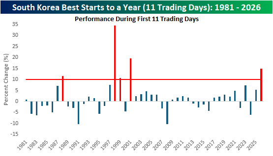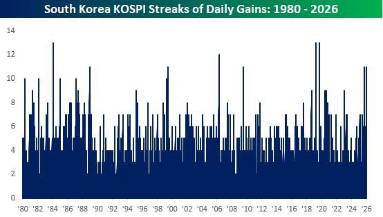 In local currency terms, the KOSPI traded higher on all eleven trading days this year. That’s an impressive streak, but it had another streak of the same length back in September. Before that, though, you have to go back to 2019 to find a streak lasting as long or longer. In fact, that 13-day streak in September 2019 was tied with a streak in April 2019 and February 1984 for the longest on record.