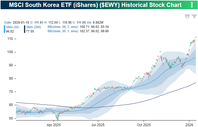 Getting back to the performance of South Korea, 2025 was already a strong year for the country, but it hasn’t skipped a beat so far in 2026. The chart below shows the performance of the MSCI South Korea ETF (EWY), and even after accounting for changes in the currency, it’s been a series of record highs all year.